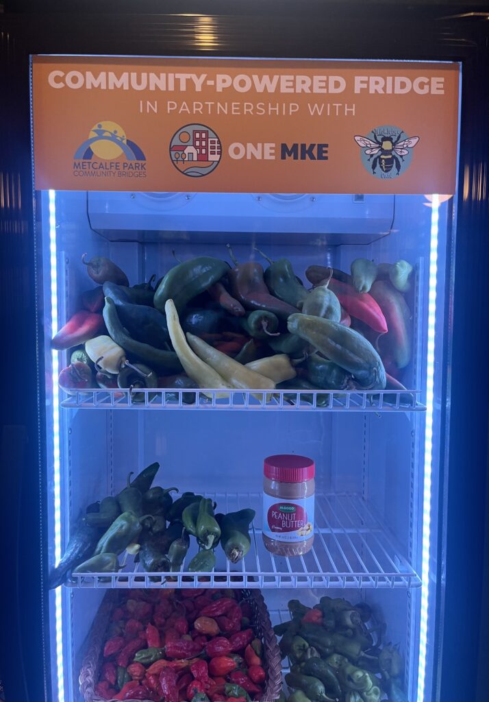 We host a community-powered fridge. People may donate unexpired/unopened food items and fresh produce to the fridge. Neighbors may take food from the fridge as they need it.