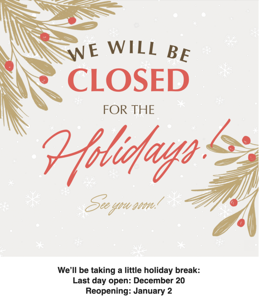 We are closed for the holidays. We will be open again for our regular hours on Friday, January 2nd.