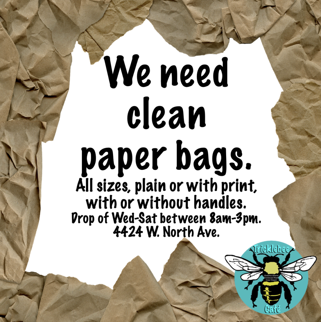 You may bring these donations to the cafe anytime we are open: Wed-Sat 11am-2pm.